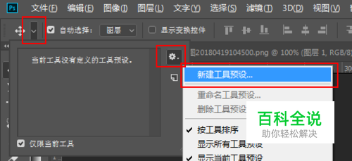 然后点击左侧向下的小箭头图标^,打开工具预设对话框,再点击右侧齿轮图标,点击新建工具预设,具体看下图红框的位置