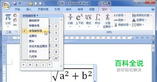 Word2007公式工具中包含创建公式所使用的所有字母类符号,在Word2007公式中添加字母类符号的步骤如下所述: