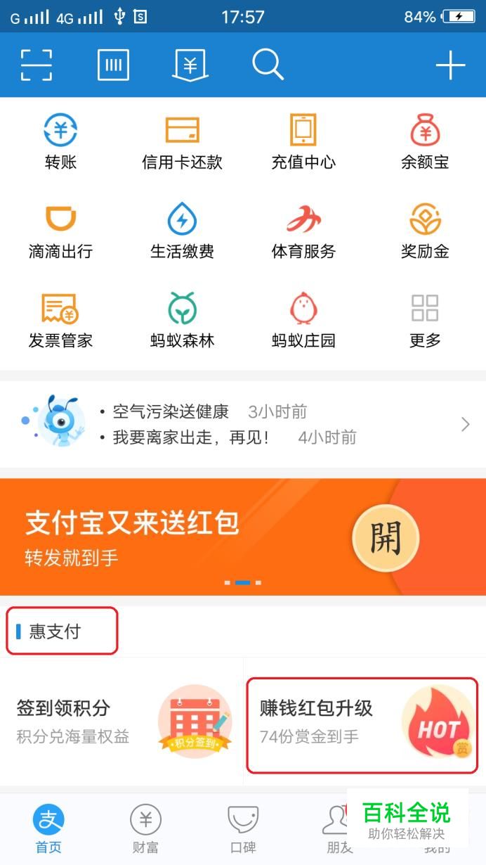 首先,我们打开支付宝首页,看到在“惠支付”栏下有“赚钱红包升级”的图标(这个图标有时候会变化,注意看下方有“赏金到手”小字字样),点击一下。