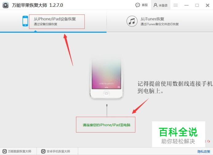 运行万能苹果恢复大师,在主界面上可以看到有两种模式,其一是直接iPhone设备扫描,其二是iTunes备份后扫描,这里我们选择iPhone设备扫描去恢复。