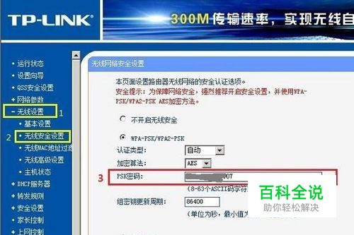 第二步:登录路由器成功后,我们这里以最常见的TP-Link无线路由器为例,教大家如何修改无线密码(Wifi密码)。 进入无线路由器设置后,修改Wifi密码则非常简单,首先找到“无线设置”,然后再展开“无线安全设置”,这这里边,我们修改“PSK密码”即为我们需要修改的Wifi密码了,我们将其修改为我们自己容易记住的新密码即可,完成之后,别忘了点击底部的“保存”,如下图所示。