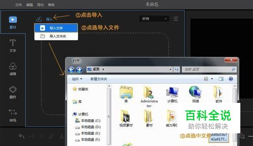 点击后就会进入软件的主操作界面,我们把鼠标移放到“导入”文字上,就会出现下面两个选项,一个是“导入文件”另一个是“导入文件夹”。点击导入文件,将视频和添加到软件上来就可以了。
