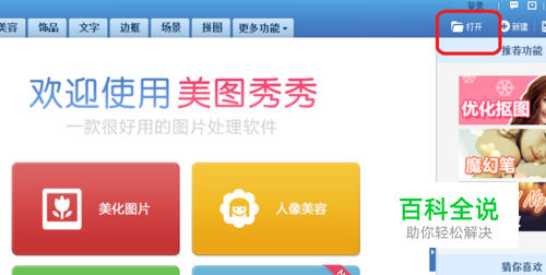 首先双击鼠标左键,打开“美图秀秀”的图标,打开之后,大家会看到“美图秀秀”的操作界面,在操作界面的右上角有一个“打开”按键,鼠标左键点击“打开”按键。