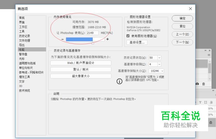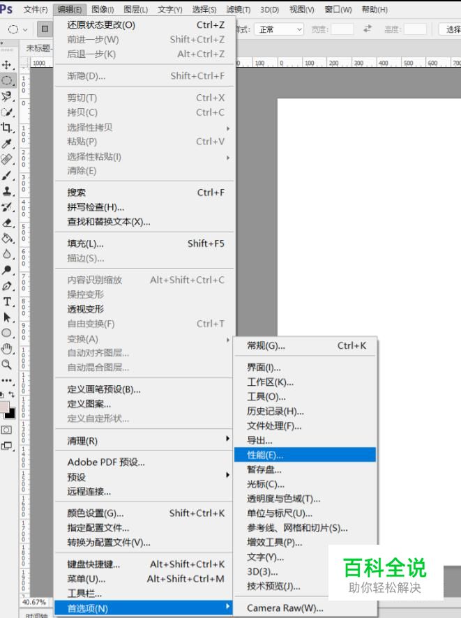 打开Photoshop,选择工具栏中 编辑>首选项>性能,如下图