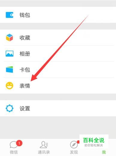 打开手机,进入微信,在“我”页面,点击“表情”进入下一页面,如图所示。