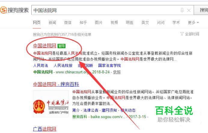 打开电脑,进入搜狗浏览器,搜索“中国法院网”,点击并进入,如图所示。