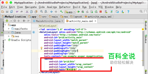 首先我们布局文件activity_main中创建一个button,设置id为“ btn”。