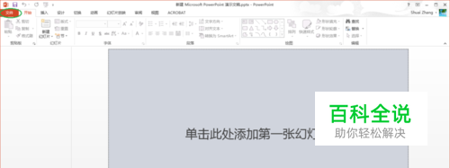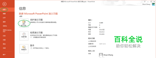 以Microsoft Office PowerPoint 2013为例,新建Microsoft PowerPoint 演示文稿,打开文档,点击左上角“文件”,在“信息栏”右侧找到“保护文档”选项卡;