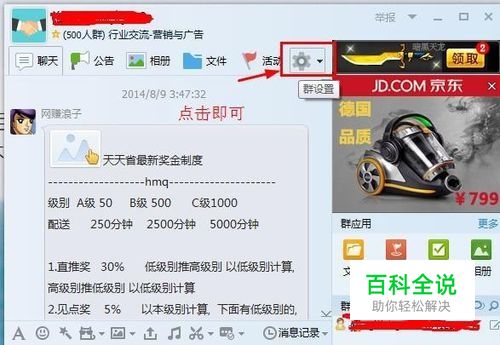 一、首先打开QQ软件,登陆自己的账号,选择自己的要更换头像的QQ群,点击群上方的设置按钮。