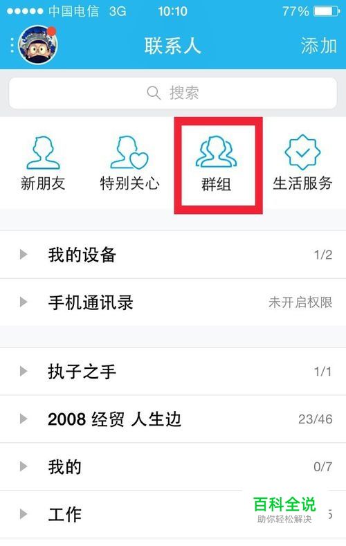 首先,打开QQ软件,点击“联系人”这个选项,你就会看见如图的界面,然后点击“群组”,如图中红色方框里的标识,这个标识是“群”的标识。