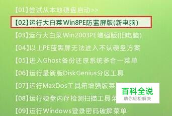 开机按下f12,引导u盘进入大白菜主菜单,选择“【02】运行大白菜Win8PE防蓝屏版(新电脑)”回车确认