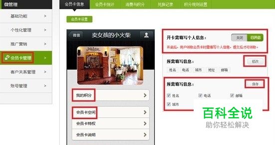 1、首先,在微信管家后台会员卡信息里面商家可选择开启/关闭“开卡需填写个人信息”(开启后,用户领取会员卡时需填写个人信息,提交后才可领取。)所需填写信息包括姓名、电话、邮箱、城市、地址,商家根据需求进行勾选,可勾选一项也可全部勾选,勾选完后,点击保存即可。