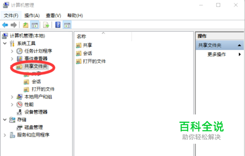 点击共享文件夹,界面如下。 进一步点击共享,显示此电脑所有共享名及对应的文件夹,在共享项上点击右键可停止共享或打开对应的文件夹。共享名中带$符号的为系统自动共享文件夹,不要人为改变。 点击会话项,显示正在访问此电脑的其它电脑列表。 点击打开的文件项,显示其它电脑打开的此电脑的共享文件列表。