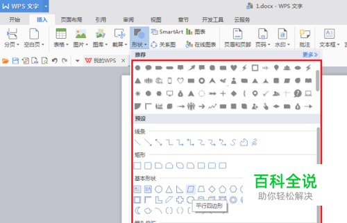 第一步在我们的电脑上打开文档,点击插入->形状,如下图所示: