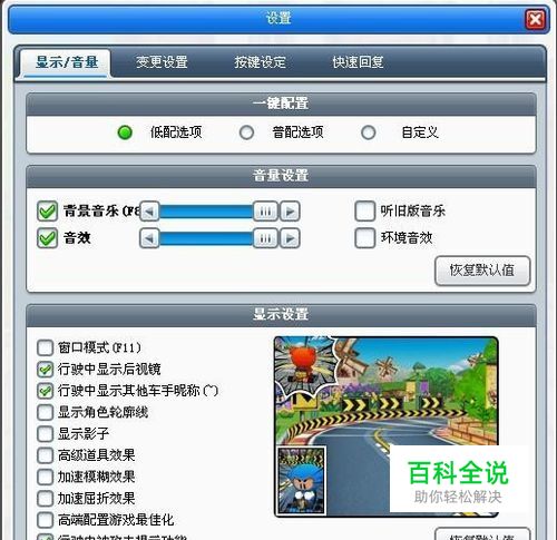 可使用系统预定义设置:低配选项和普配选项。也可以在“音量设置”和“显示设置”框中根据需要自行勾选,进行自定义配置。