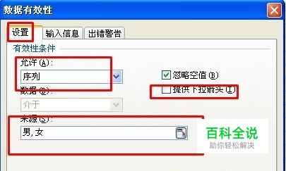 进入有效性设置页面有点击,设置选项卡,有效性条件选择序列,勾选掉提供下拉箭头,来源输入男,女。 注意逗号要英文半角输入。