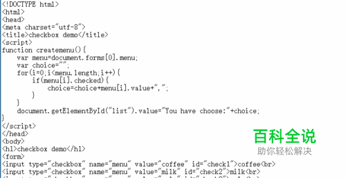 第一步演示如何使用checkbox 在<form></form>标签内使用<input type="checkbox" name=" " value=" " id=" ">编辑一组checkbox,通过name获取checkbox数组。根据状态,获得数值。 <!DOCTYPE html> <html> <head> <meta charset="utf-8"> <title>checkbox demo</title> <script> function createmenu(){ var menu=document.forms[0].menu; var choice=""; for(i=0;i<menu.length;i++){ if(menu[i].checked){ choice=choice+menu[i].value+","; } } document.getElementById("list").value="You have choose:"+choice; } </script> </head> <body> <h1>checkbox demo</h1> <form> <input type="checkbox" name="menu" value="coffee" id="check1">coffee<br> <input type="checkbox" name="menu" value="milk" id="check2">milk<br> <input type="checkbox" name="menu" value="cola" id="check3">cola<br> <input type="checkbox" name="menu" value="juice" id="check4">juice<br> <input type="button" onclick="createmenu()" value="click here to create the menu"><br> <input type="text" style="width:1000px;height:20px" id="list"> </form> </body> </html>