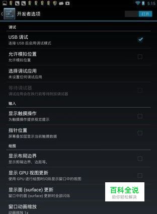 确认开启【USB调试】模式。Android4.0以前版本开启方法:设置--应用程序--开发,勾选【USB调试】。Android4.0以后版本的开启方法:设置--开发人员选项,勾选【USB调试】。