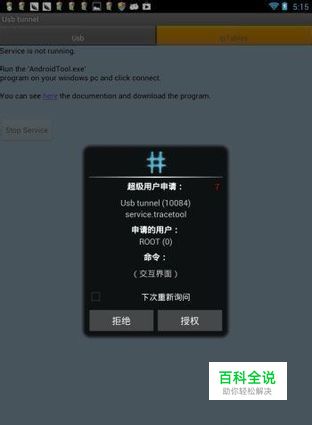 将手机用USB数据线连接电脑。在手机端运行刚刚安装的【Usb tunnel】,首次运行需要授予Root权限。