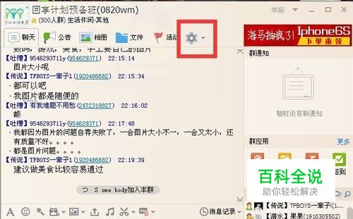 打开QQ群聊天的窗口,在聊天窗口中,选择如图中一个齿轮图标单击打开,