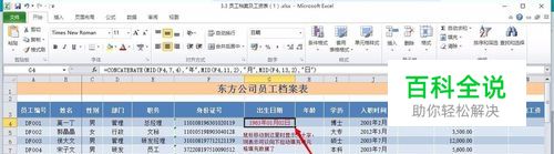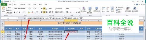 提取员工出生日期:通过MID提取年、月、日再通过CONCATENATE函数将他们连接起来形成出生日期,首先鼠标点击G4单元格,然后在编辑栏里输入嵌套函数 =CONCATENATE(MID(F4,7,4),"年",MID(F4,11,2),"月",MID(F4,13,2),"日")按回车键,这样员工的出生日期的在G4单元显示出来了然后再拖动单元左下角向下进行填充,这样员工的出生日期就提取好了。
