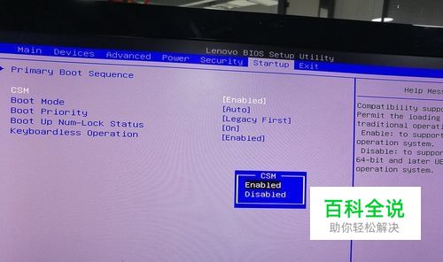 设置电脑bios的开机启动---(用来设置优先选择U盘 启动 进入PE系统) 插入U盘 重启电脑 等电脑屏幕黑了后同时不断 按 ESC F1 F2 F3 DEL(不同电脑的开机进入bios快捷方式是不一样的) 进入后选择(下面我以联xiang电脑为例)“startup”---“CSM--显示的是diable”--要点开选择“enabled”----下面Boot Priority (启动优先) 选择 “Legacy First(这个Legacy引导方式是 旧版 就是win7那些系统都用这个,而UEFI的话是现在新电脑 装win8 win10的)”---然后选择最上面的 “Primary Boot Sequence(这里设置用U盘还是硬盘启动)”----我们按上下键盘的箭头找到“USB KEY group”----按“+”号键键该项往最上面顶!----然后“F10”----“YES(会自动保存并重启)” 重启进入“优启通”画面 ,选择“启动Windows 10PE x64 新机型”