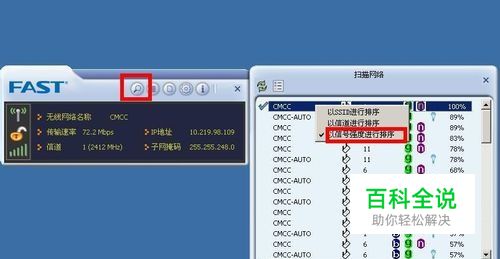 首先,我们点击第一个放大镜图标的按钮,就可以打开下图所示的一个弹出菜单,可以看到这里列出了很多的无线网络,我们可以右键点击选择按信号强度排序,就可以选择一个信号最强的来连接了;