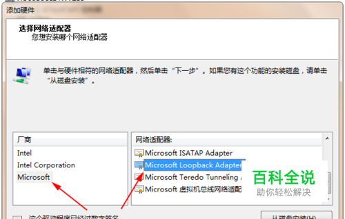 左边选择 microsoft,右边选择 microsoft lookdlookback adapter,点击下一步,再点击下一步