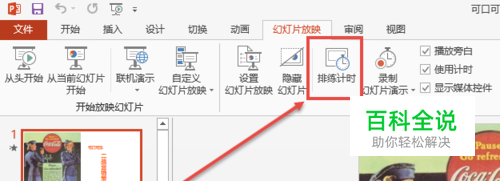 打开PPT,切换顶端菜单至“ 幻灯片放映”——点击“ 排练计时”按钮。