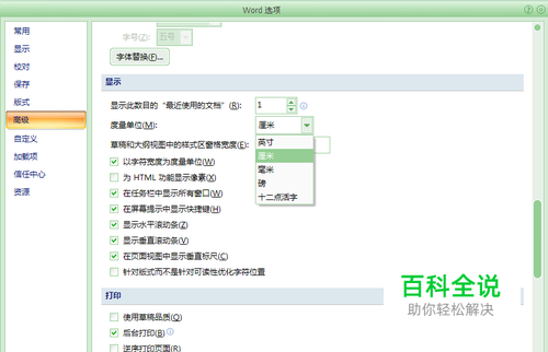 在弹出的“word选项”对话框中点击左边的“高级”,找到“显示”标签,在“度量单位”下拉菜单中找到“厘米”