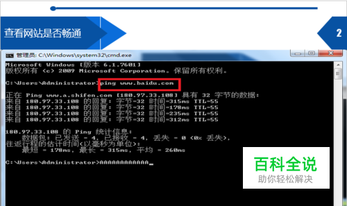 2.查看网站是否畅通 如图,输入ping+空格+网址,查看网络的畅通性,排除网站自身服务器的问题,这时在尝试刷新网站。