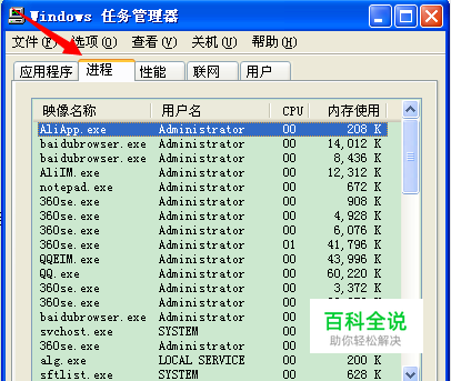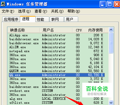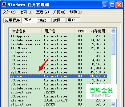 在进程选项下我们这里要找到QQ.exe,并点击选中一下这个选项,然后再点击选项界面下的“结束进程”按钮。