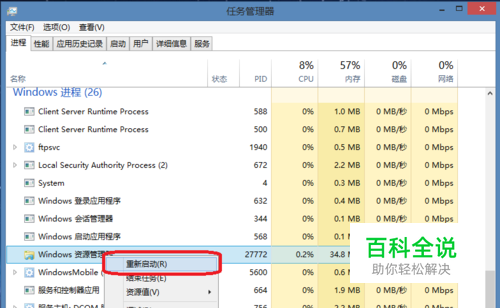 在 【Windows 进程】部分,右键 ”Windows资源管理器“选择重新启动即可。