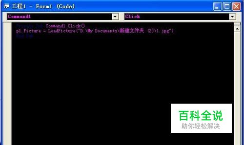 双击命令按钮,进入代码编辑器, p1.Picture = LoadPicture("D:\My Documents\新建文件夹 (2)\1.jpg")