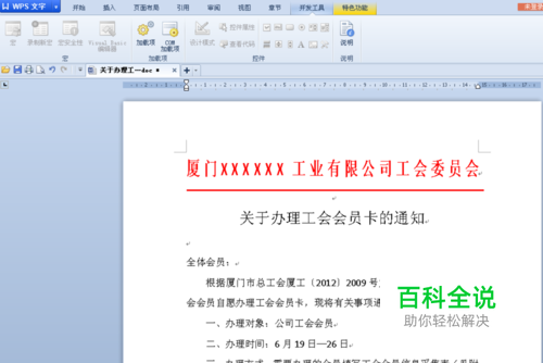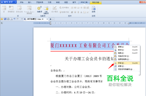 然后把红头部分“厦门XXXXXX工业有限公司工会委员会”全部选中,在选中部分单击鼠标右键,选择【字体】。如图: