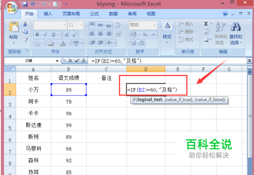 假设成绩大于等于60的为及格,我们需要输入的公式为“=IF(B2>=60,及格)”,点击enter键,出现第一个的同学成绩为及格。