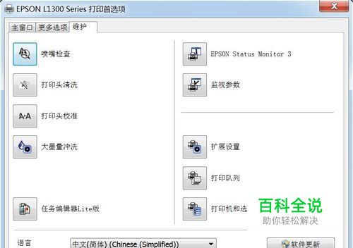这时候,点击(维护)选项卡,先执行左上的喷嘴检查,这时候打印机会打印一张纸,上面是倾斜的网状图,可以很容易的看到是否有断线、残缺的地方,如果有,就需要进行喷嘴清洗。