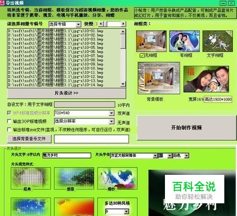 制作视频 点击视频输出,可制作多种视频效果,主要有:无相框视频、有相框视频、文字相框视频、背景模板视频,分辨率从CVD到DVD到1920*1080,都可以选择。值得一提的还可将主题文字制作成精美的片头。
