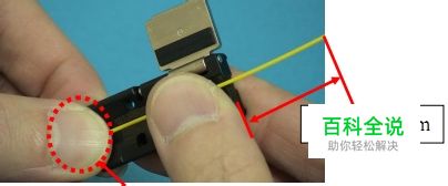 下面要用光纤切割刀切割合适长度的光纤芯,上面一步播出了大约3-4cm的光纤芯,至于本步骤要切出多长,要根据光纤熔接机来调整,如图:护套压板到接近电极的距离就是要切割出得长度