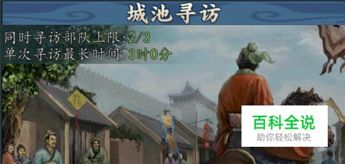 快速入城寻访 攻克城池后,玩家就可以派出队伍进行寻访,不过需要玩家注意的是,城中只允许同时有三只部队进行寻访。所以,攻克城池后要快速派出队伍入城进行寻访(寻访的操作方法可参见下面这篇经验文章),否则容易被其他玩家抢得先机,而致使自己失去了寻访的机会。另外,玩家要注意寻访的时间限制为3小时,在这3小时内派出的寻访部队无法承接其他任务的,除非玩家将寻访部队撤回。