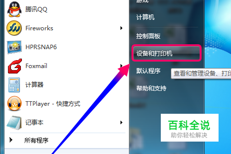 第一种方法是在本机上操作 因系统不统一,这里先以Win7为例,点击开始菜单选择[设备和打印机]