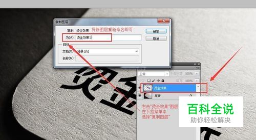 第七步:我们需要将“烫金效果”图层再复制一个一模一样的图层来。右击“烫金效果”图层,弹出下拉菜单,在菜单中选择【复制图层】,即可复制一个和原图层一模一样的图层出来,我们将其命名“烫金效果1”图层。如图所示!