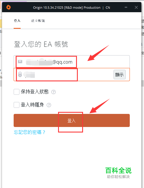 这时启动了origin桔子平台,输入你的游戏账户和密码,点击登陆,如下图所示