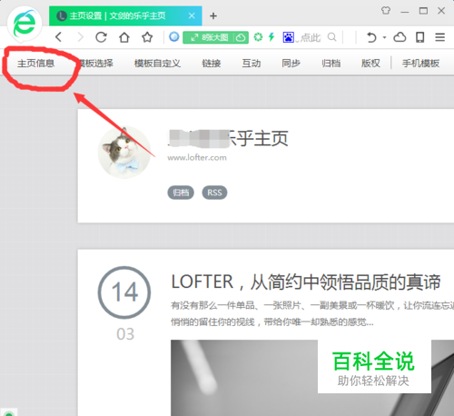 打开后会看到主页上有个菜单栏,LOFTER主页能更改的功能属性都在这里了,现在就可以开始设计你的主页了,首先点击打开主页信息菜单。