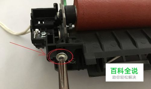 (四)接下来,拆下左右两边两个白色塑料接头,小心取出定影加热辊。见图(五)、图(五)-1、-2