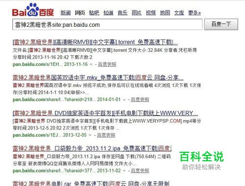 在百度搜索框里面输入 :雷神2黑暗世界site:pan.baidu.com PS:雷神2暗黑世界 。是我在此举例 。需要搜索的资源名字,如果你需要搜索其它的,直接改换成你需要的资源的名字即可。如下图,然后点击【百度一下】 是不是很多种子资源呢?