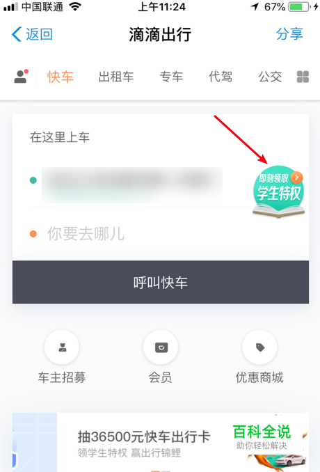 打开滴滴出行后,我们可以看到有领取学生特权,我们点击它