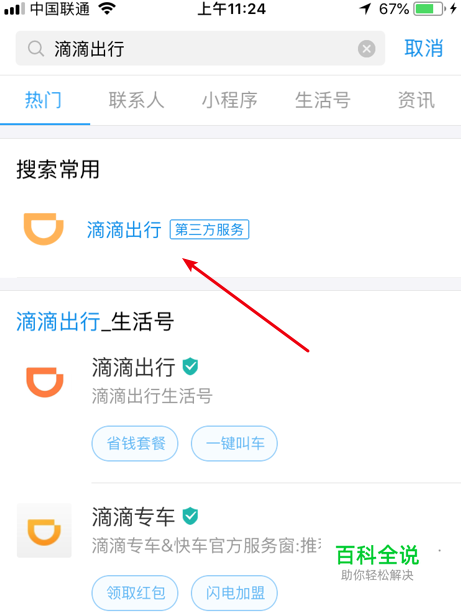 由于本人未下载滴滴出行app,所以一般打滴滴都是用支付宝,我们在支付宝中搜索滴滴出行点击打开