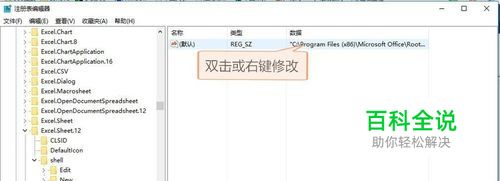 第二部,Win+R运行,输入regedit确定,编辑注册表,依次打开HKEY_CLASSES_ROOT\Excel.Sheet.12\shell\Open\command,双击或右键修改编辑第一个默认文件文件,在数值数据栏中的最后添加 空格"%1"(此空格需加在.EXE”之后如.EXE” “%1”) "C:\Program Files (x86)\Microsoft Office\Root\Office16\EXCEL.EXE" 改为"C:\Program Files (x86)\Microsoft Office\Root\Office16\EXCEL.EXE" "%1" 点击确定