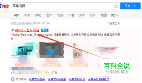 首先需要进入苹果官网,百度直接搜索苹果官网,点击进入苹果官方网站如下图所示。